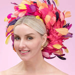 Step into vibrancy with the Carnival Feather Ring Hat. A joyful, whimsical headpiece bursting with color and movement—perfect for Spring Racing Events, Fashion on the Fields, or any standout occasion. Adorned with trimmed and coquille goose feathers. Feathers arranged for a light, airy sway. Dark hues blended with soft pastels. Includes combs, elastic, and pins for secure placement.