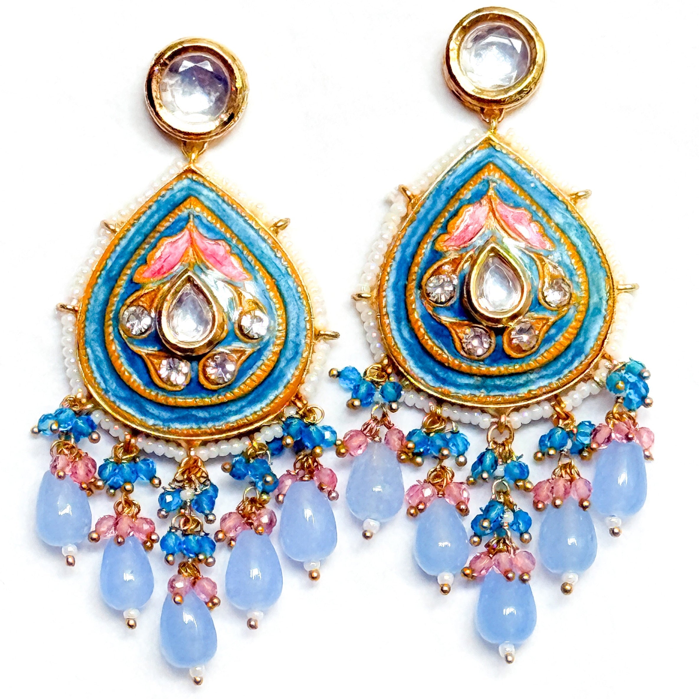 Add a splash of color and tradition to your jewelery collection with these exquisite handcrafted in natural "Lac"; resinous substance. These earrings are hand-painted both face and back and designed in a teardrop silhouette, the vibrant turquoise blue enamel base is beautifully detailed with pink and gold floral-inspired patterns.