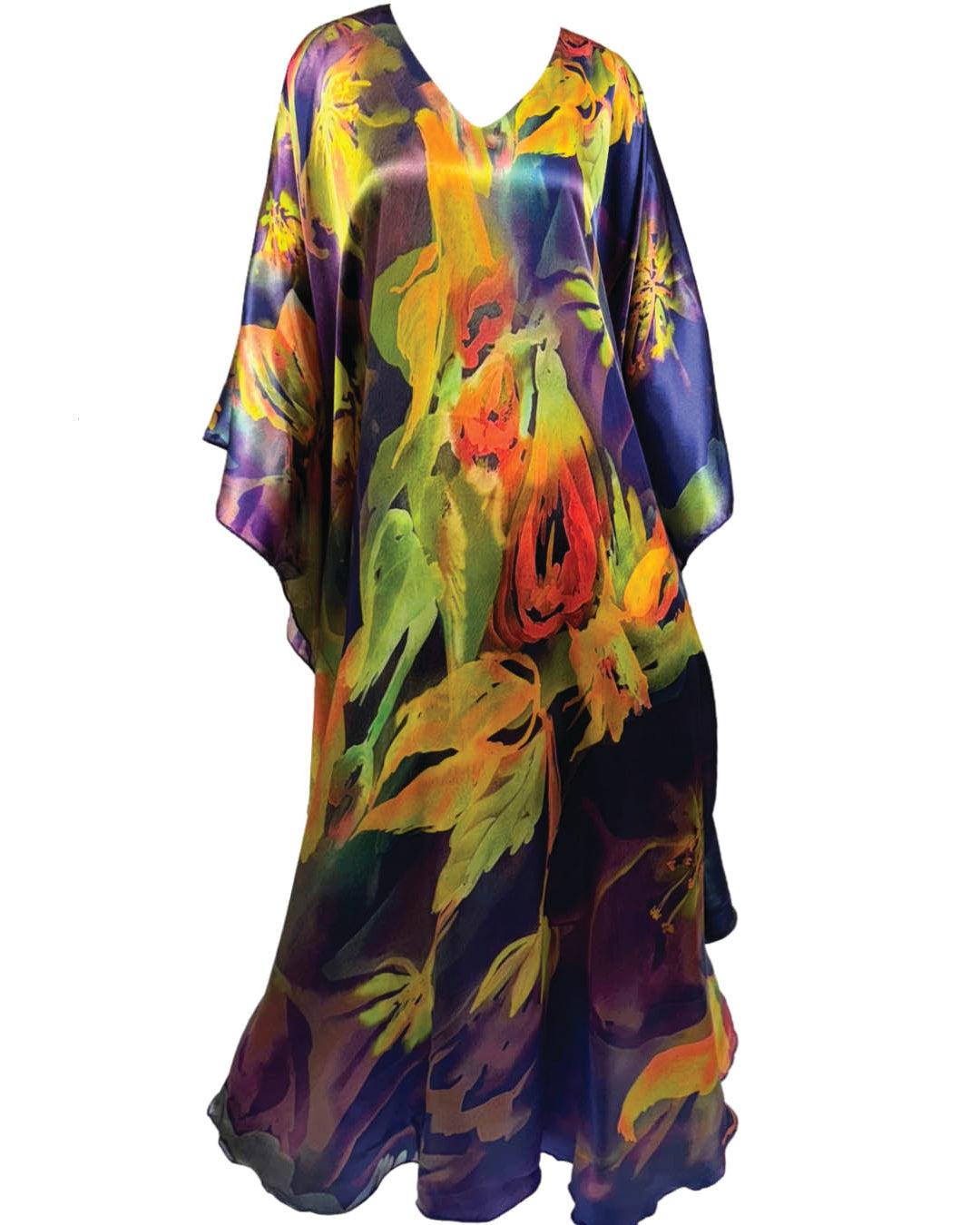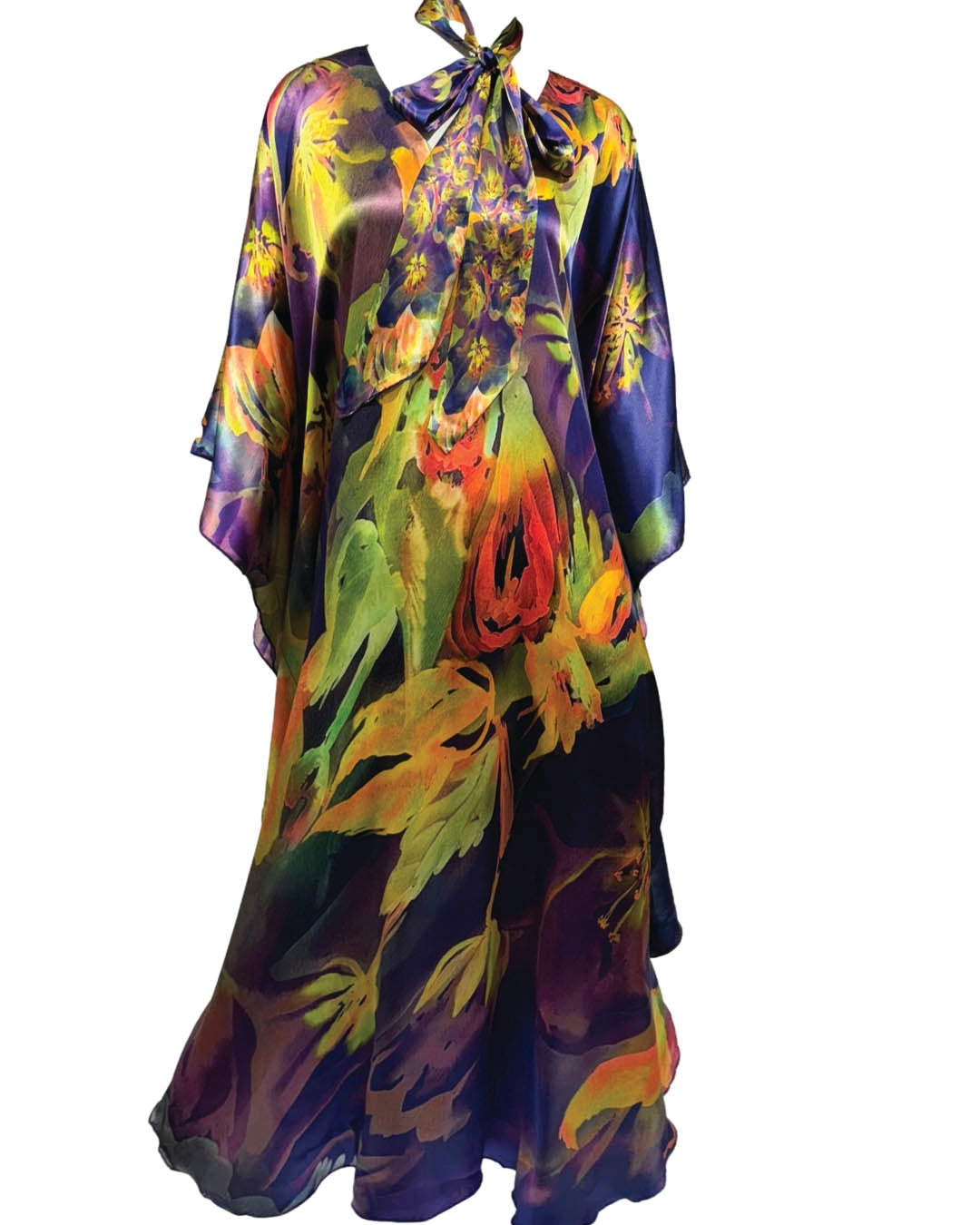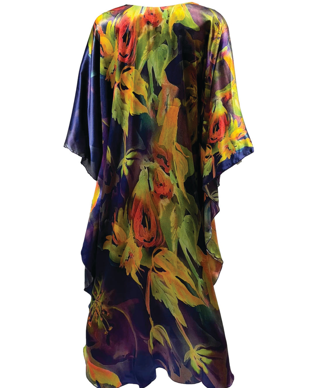 An impression drawn from Javad’s original watercolour painting, the Cold Spring Night Kaftan is crafted in 100% silk satin and designed in a flowing maxi silhouette. At 135cm in length and cut in one size, it drapes with effortless elegance.