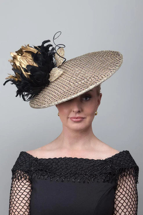 The Gold Mesh Dior Brim features a soft gold lurex underside and a top in vintage Japanese Obi fabric, layered with light-gold and black diamante mesh. Finished with a large hand-made black-and-gold feather flower and quills—stunning with a simple dress.