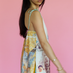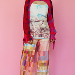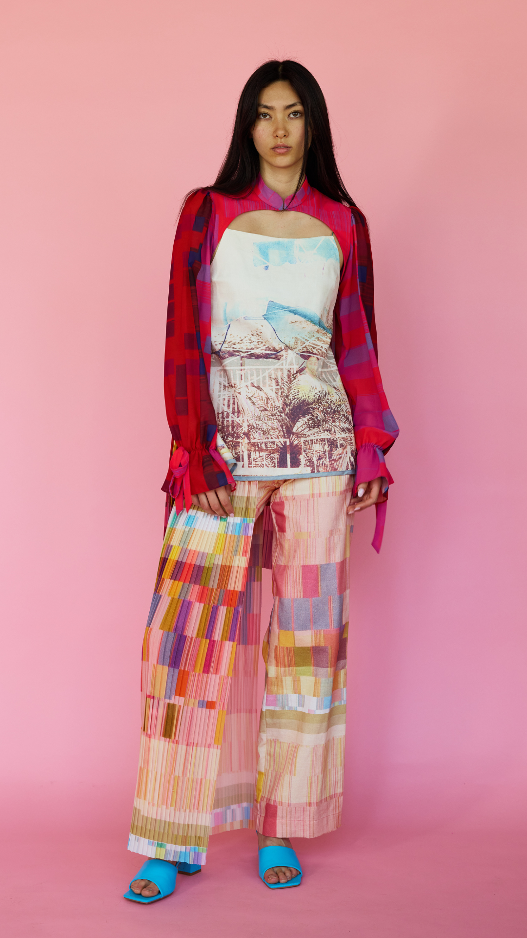 A study in duality and quiet nostalgia, the Sky Lounge Tunic Top features a poolside tropical print on the front; lush, sunlit, and dreamlike, while the back reveals unique vintage couch imagery, evoking domestic intimacy and faded grandeur. Crafted in 100% cotton, the silhouette is softened by delicate pleating at the back, allowing the garment to shift gently with movement. Aqua blue satin cord ties at the shoulders reference traditional Chinese knotting materiality, adding a subtle cultural thread to the design. This piece invites the wearer to inhabit both escape and memory, lounging between worlds. 100% Cotton