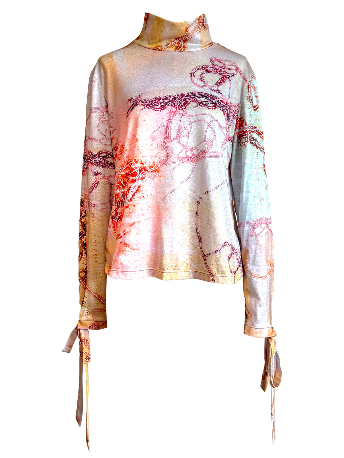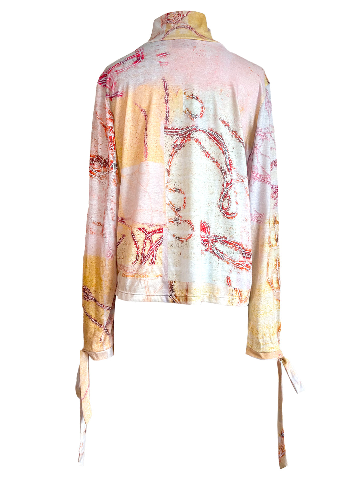 A tactile reflection on connection, the Strings of Fate long sleeve top is crafted in soft cotton jersey with a classic mock neck silhouette. The painterly print featuring butter yellow, ochre, magenta, and rust, unfolds like a woven narrative, inspired by the idea that threads can bind stories, people, and time. Slip-on in style, the piece is finished with delicate ties at the wrist. 100% Cotton