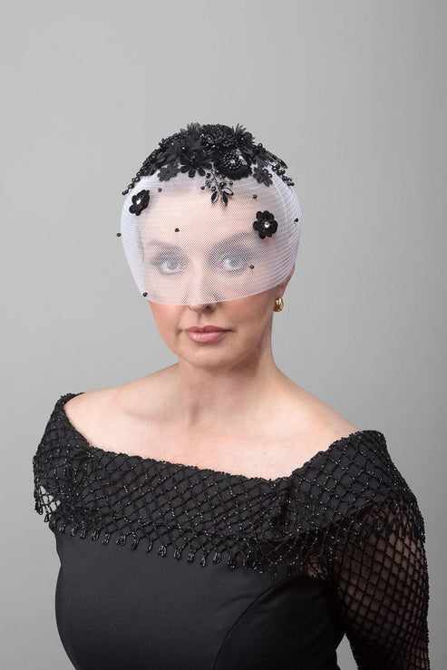 The White Beaded Veil Headpiece is hand-beaded with black beads and lace. A heavier white crinoline mesh veil adds couture drama while remaining feather-light to wear. Elegant “Gatsby” vibes—pair with a sleek bun and monochrome dress to stand out.