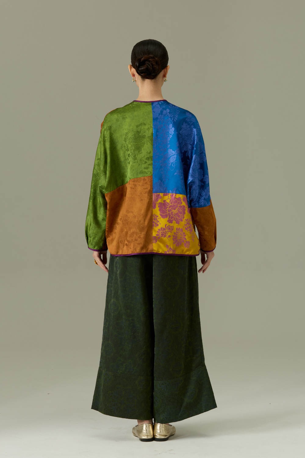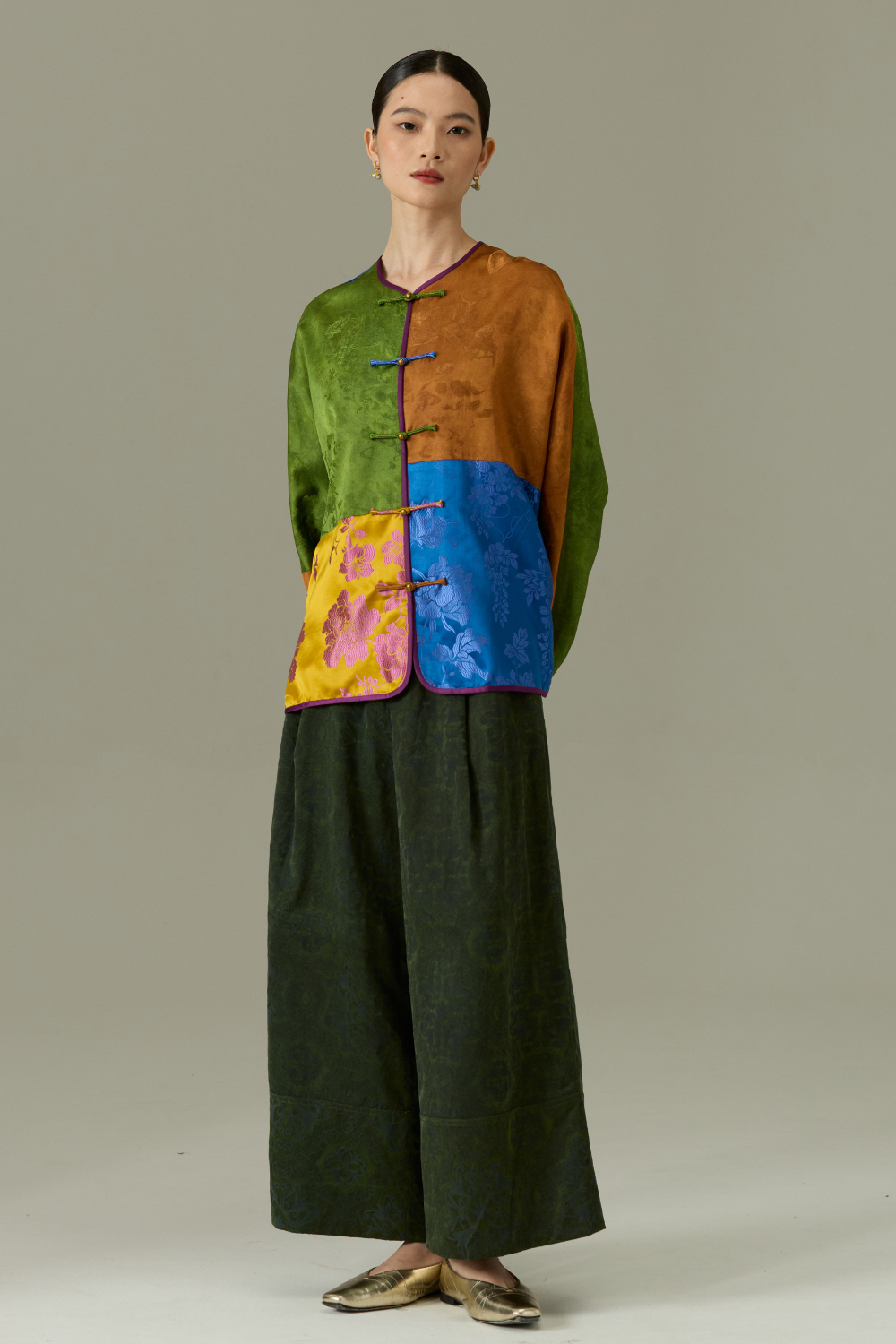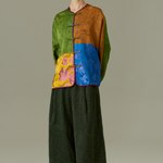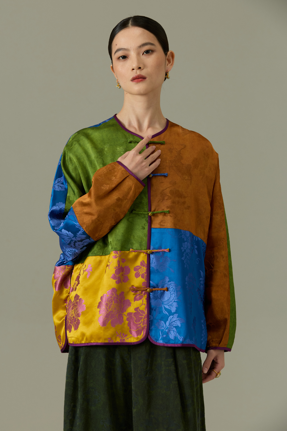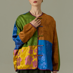 A vibrant fusion of tradition and modernity, the Dynasty Patchwork Jacket features a rich mosaic of brocade panels in earthy greens, golden yellows, deep blues, and rustic browns. Each segment showcases intricate floral motifs, creating a tapestry of cultural elegance. Finished with classic frog button closures and a subtle purple trim, this statement piece offers timeless style with an artistic edge. Perfect for elevating both casual and formal looks.