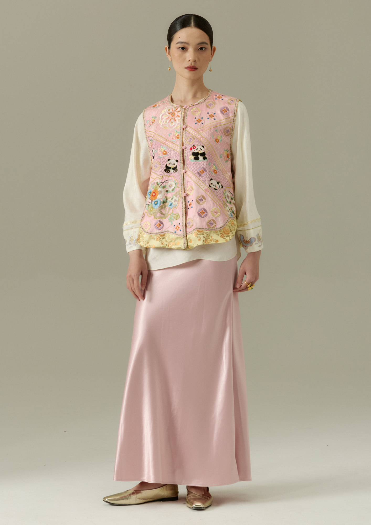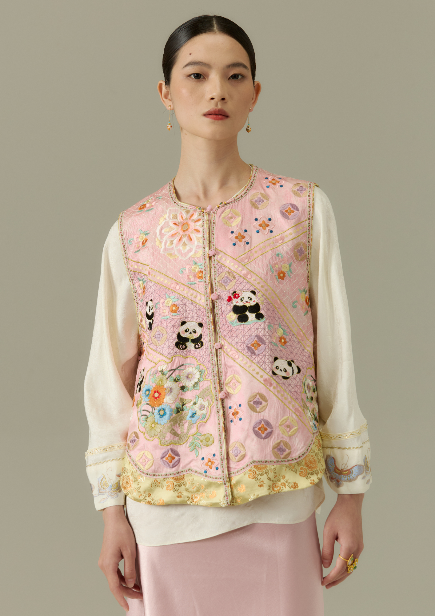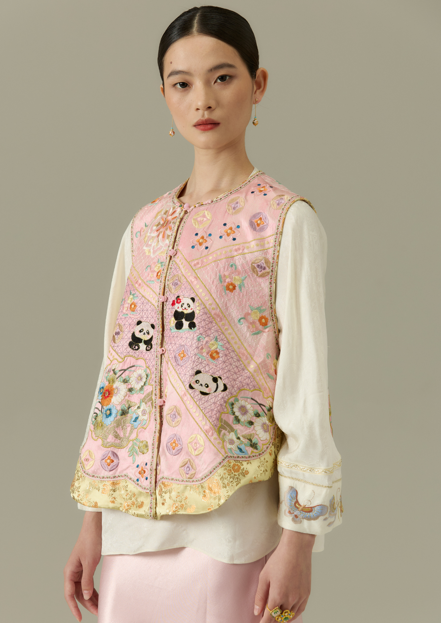 Charming and playful, the "Tuan Yuan" Embroidered Panda Vest is a statement piece that blends whimsical artistry with traditional flair. Made with premium fabric and detailed embroidery, this vest features delightful panda motifs that add personality and storytelling to your wardrobe. Wear it layered over our "Moonlight" white blouse or dress for an effortlessly unique, standout look.
