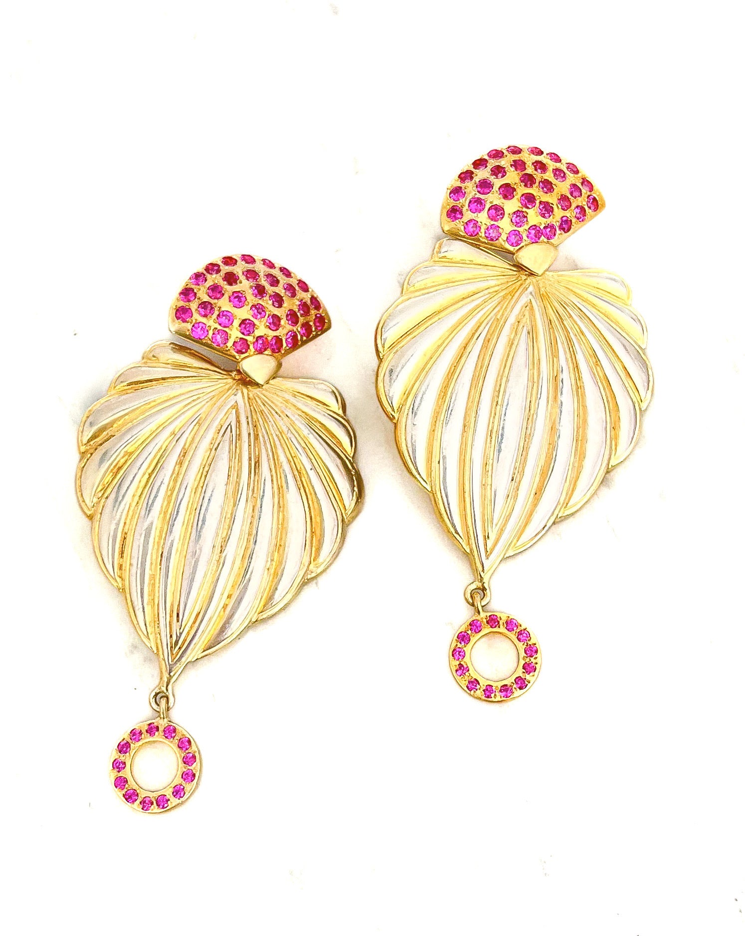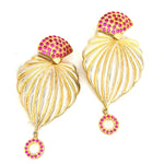 The top portion is adorned with shimmering pink coloured Zircons gemstones, adding a vibrant pop of color, while a matching circular drop at the base completes the look with modern sophistication.